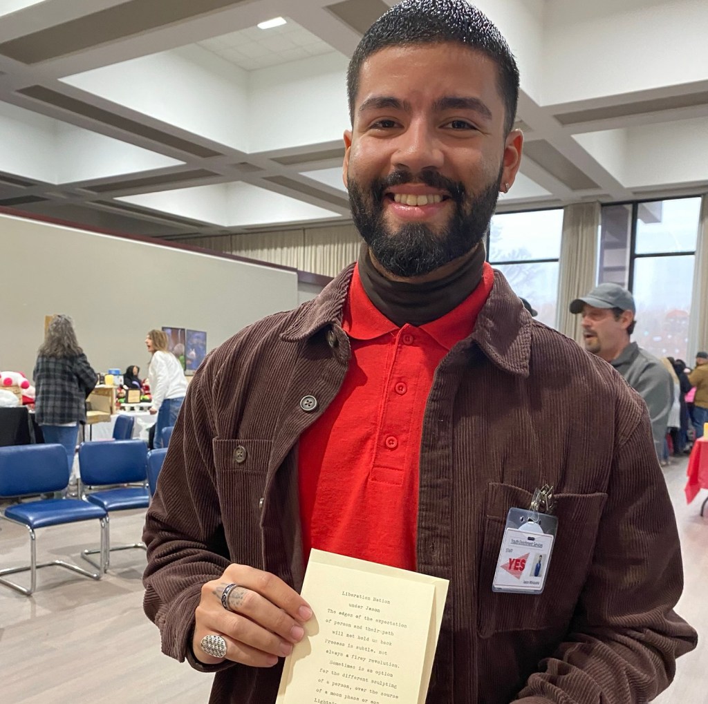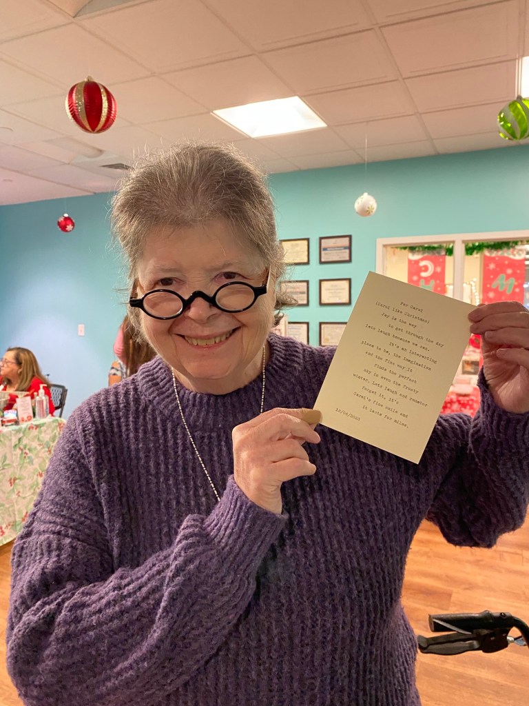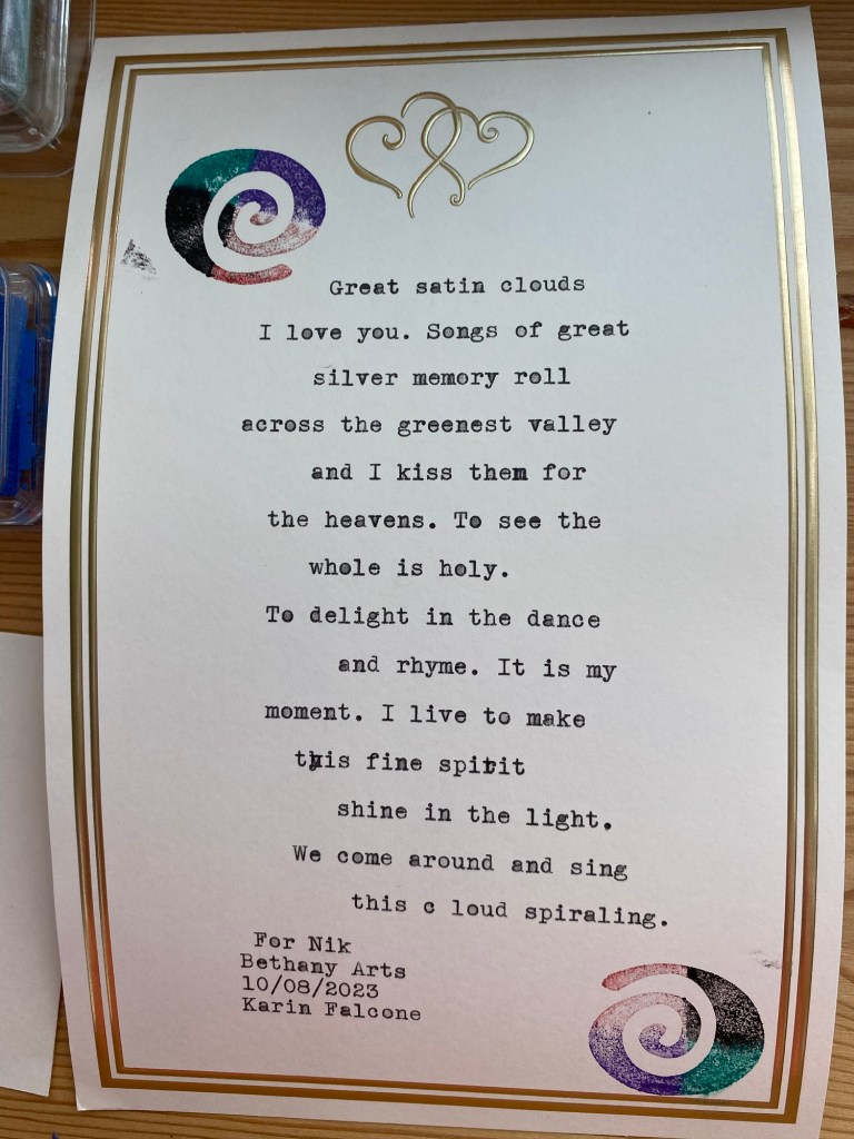 When I felt the poem was complete, I read it silently, stood and asked if I could read the poem out loud, to which people invariably said yes, and it added an additional element of performance to the project, and drew more people to the table. People enjoyed being heard and being read to, and to be given a piece of unique artwork to take home. The love letters from mothers to their babes especially touched me: it would be years before the child could read it. It suddenly achieved, with that unique audience, the element of timelessness that all poetry strives for, whether or not the poem has any artistic merit or not. It was a humbling honor, a lesson on the power of poetry. I wrote about a dozen poems that day and collected $77 in donations for Bethany Arts Community, which isn’t very much but definitely a lucky number.