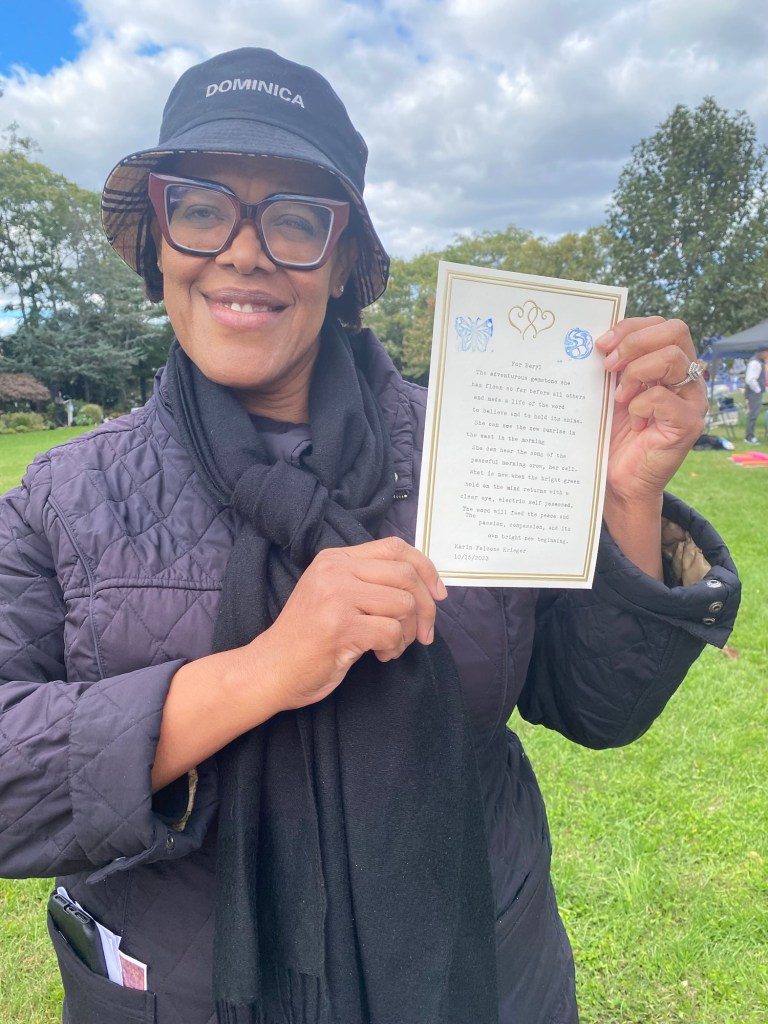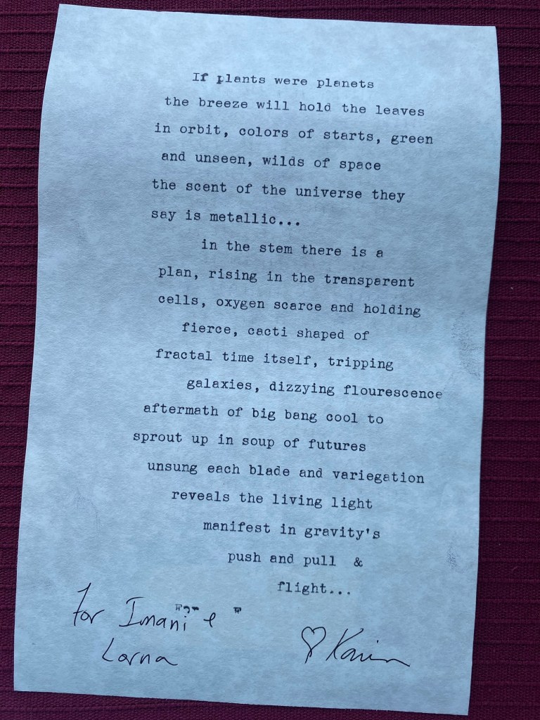I had brought with me a tin of carved erasers I had made 30 years ago when I was trading zines by mail with a couple who published “Eraser Carvers Quarterly” where I learned the technique. The stamps had not seen the light of day in years. I brought them out to “seal” the poems at the end with bright blue ink. Customers had a choice of flower, plant, butterfly or “world” designs. It was a fun way to “finish” my interaction with the piece, recalling seals on Asian brush painting. I then photographed each piece with my phone, and the people I wrote them for.