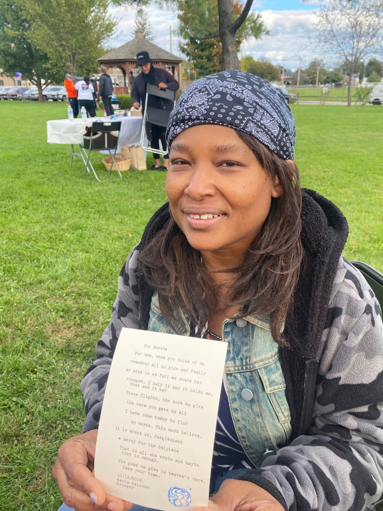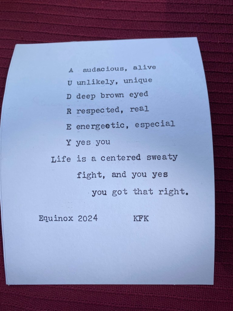 It was a stunningly beautiful autumn day. After a quiet morning, suddenly my booth was busy. I loaded my Underwood with vintage imitation parchment stationary with a real deckle edge, rescued from Savers thrift store. I put my full attention on the person or people before me, and did my best to listen and capture their words, their essence, and their names. When there were typos I had to forgive myself and ask forgiveness as well, when handing customers their poems. The 20th century machine proved glitchy when the new ribbon I had installed refused to advance, so I was forced to spin the spools by hand. It’s a learning curve to keep a nearly 100 year-old mechanical object with no instruction book working. Thank goodness for r/typewriters and Reddit in general.