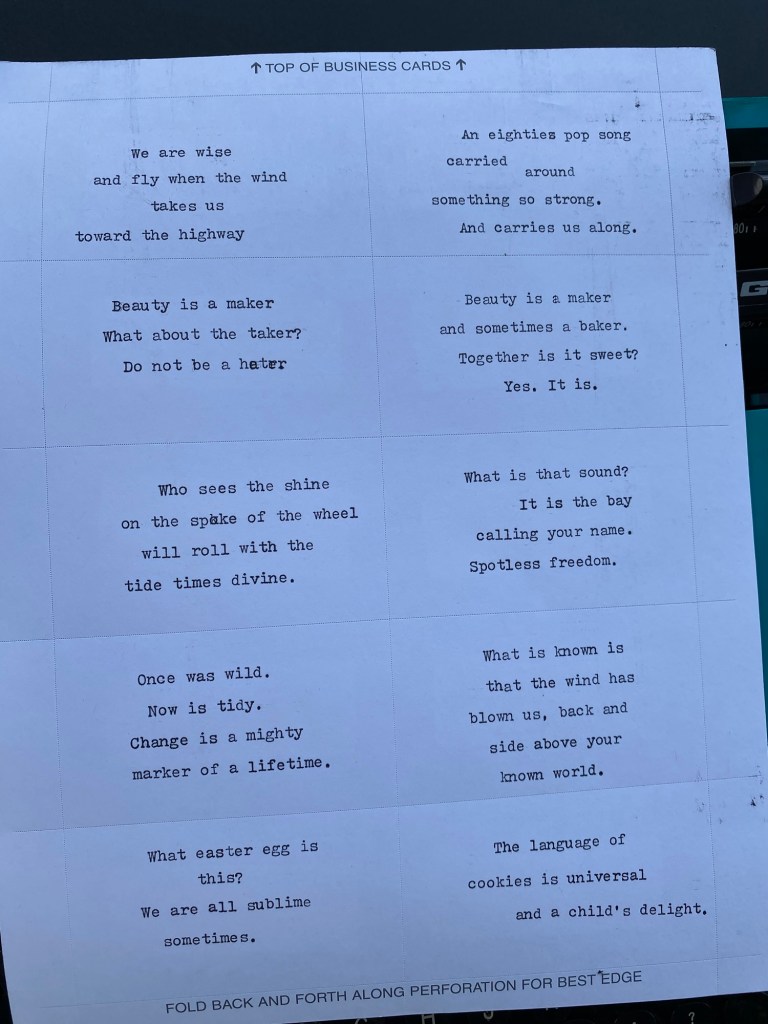 Putting Poems While You Wait out into the world was a truly life changing experience, about trusting myself, being courageous enough to change direction, trusting others to see my vision and supporting its manifestation, showing up in performance with an unusual old typewriter, and holding space for honest personal interaction with such lovely strangers.